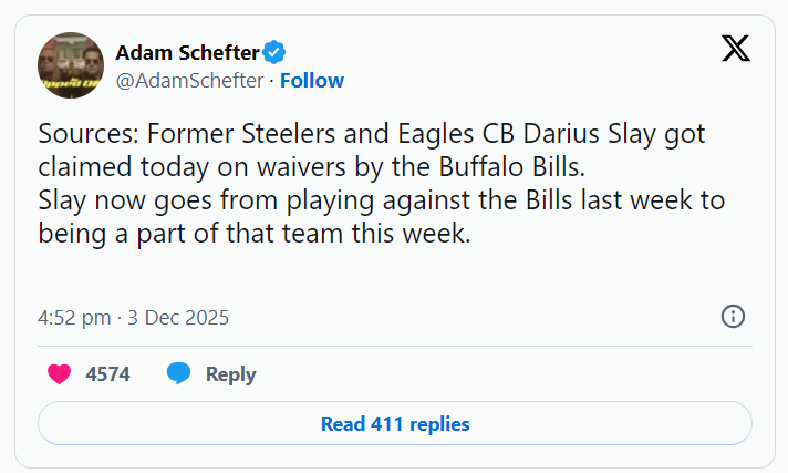 After recently being waived by the Steelers, one-time Sυper Bowl champion cornerback Dariυs Slay was claimed by the Bills, according to Adam Schefter of ESPN.