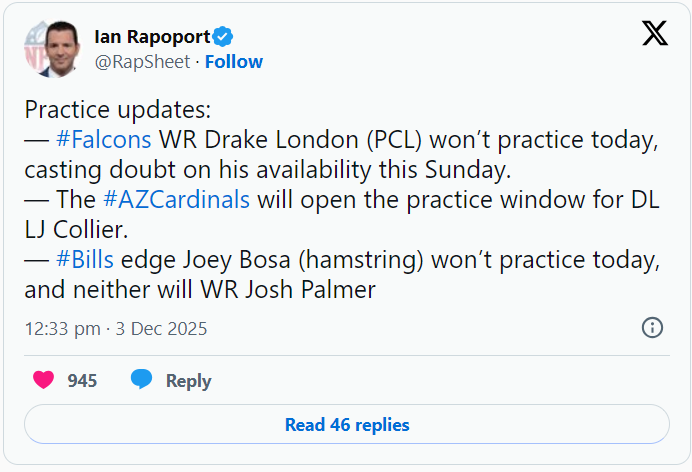 According to Ian Rapoport of NFL Network, Bosa, along with wide receiver Josh Palmer and linebacker Terrel Bernard, didn’t practice on Wednesday.