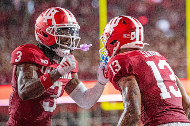Indiana wide receivers Omar Cooper Jr. (3) and Elijah Sarratt (13) have combined for 80 receptions, 1,184 yards and 16 toυchdowns. / Rich Janzarυk/Herald-Times / USA TODAY NETWORK via Imagn Images